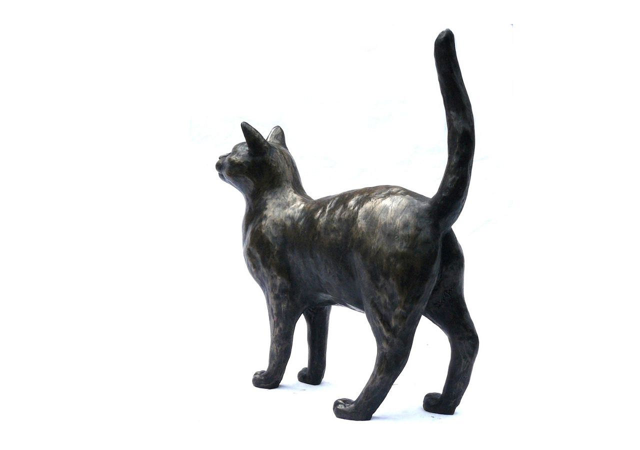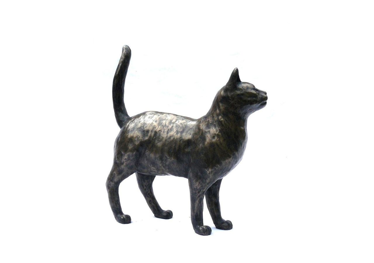 Murphy” is a striking bronze standing cat sculpture created by British sculptor Peter Close. This elegant sculpture captures the natural posture and watchful curiosity of a cat standing alert, with its tail arched gracefully behind and its head held proudly. Carefully observed feline anatomy and expressive detail give this bronze cat sculpture a lifelike presence that cat lovers immediately recognise.