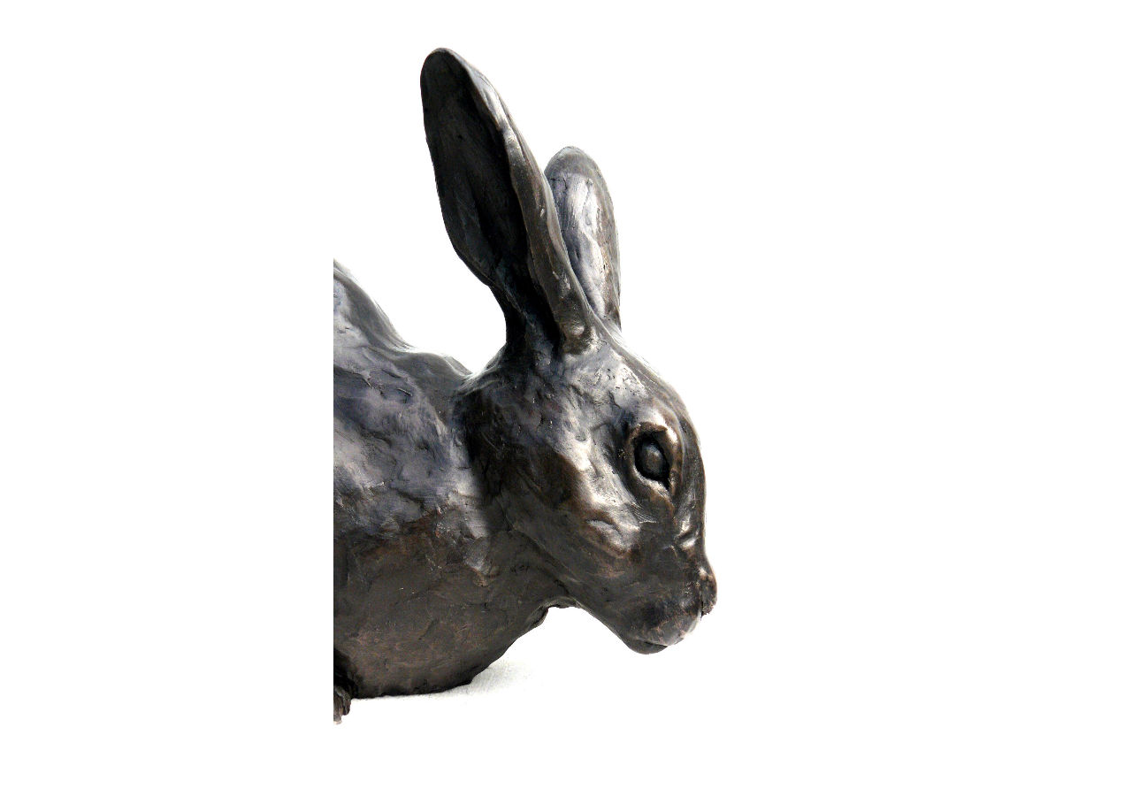 The pose conveys both energy and stillness, reflecting the natural behaviour of wild rabbits when they pause to observe their surroundings. The subtle texture of the fur contrasts with the smooth curves of the body, creating a sculpture that feels both lifelike and timeless.